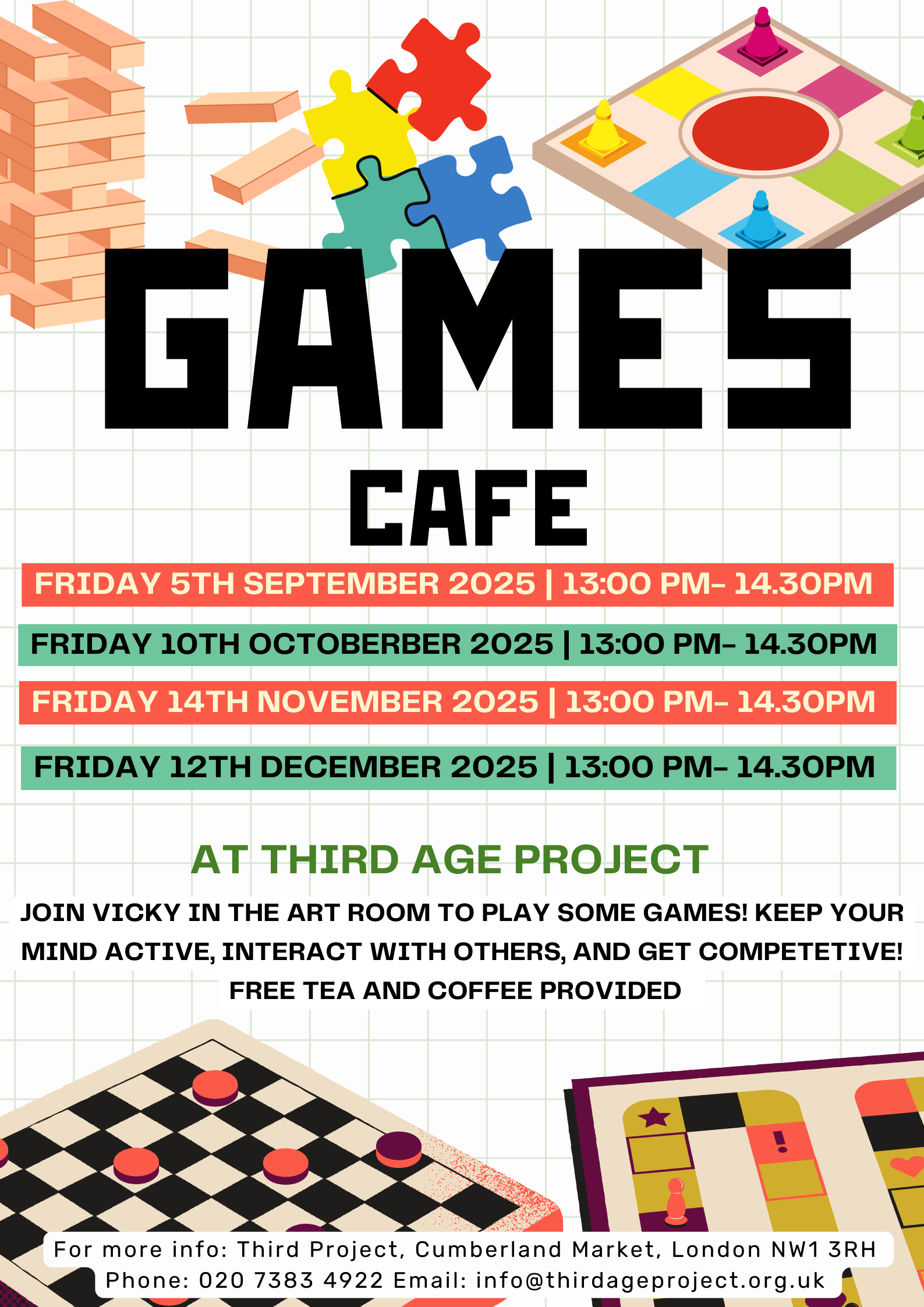 Games Cafe+ Add to Google Calendar+ iCal / Outlook export DateNov 14 2025 Time 1:00 pm - 2:30 pm LocationThird Age ProjectThird Age Project, Cumberland Market, Regent’s Park, London NW1 3RH Category Connect Organizer Third Age Project Phone +44 20 7383 4922 Email info@thirdageproject.org.ukShare this event