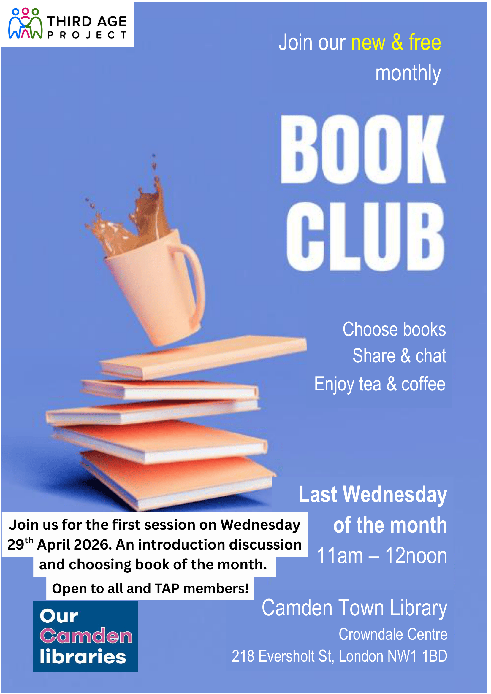 Book Club+ Add to Google Calendar+ iCal / Outlook export DateApr 29 2026 Time 11:00 am - 12:00 pm Category Connect Organizer Third Age Project Phone +44 20 7383 4922 Email info@thirdageproject.org.ukShare this event