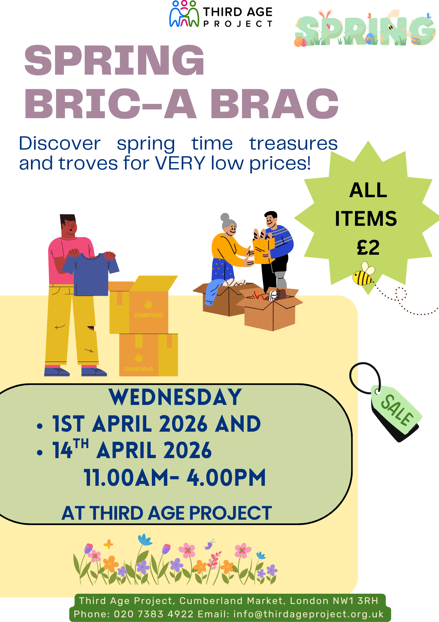 Bric-a-Brac+ Add to Google Calendar+ iCal / Outlook export DateApr 01 2026 Time 11:00 am - 4:00 pm LocationThird Age ProjectThird Age Project, Cumberland Market, Regent’s Park, London NW1 3RH Category Help Others Organizer Third Age Project Phone +44 20 7383 4922 Email info@thirdageproject.org.ukShare this event
