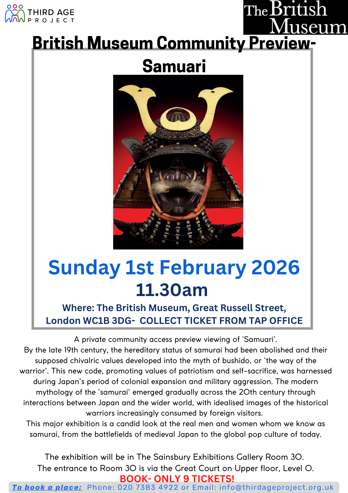 We are pleased to invite you to attend a private viewing of Samurai – Sunday 1st Feb 2026 from 11.30 to 16.50 (last entrance is 16.00) in SEG (Sainsbury Exhibition Gallery).