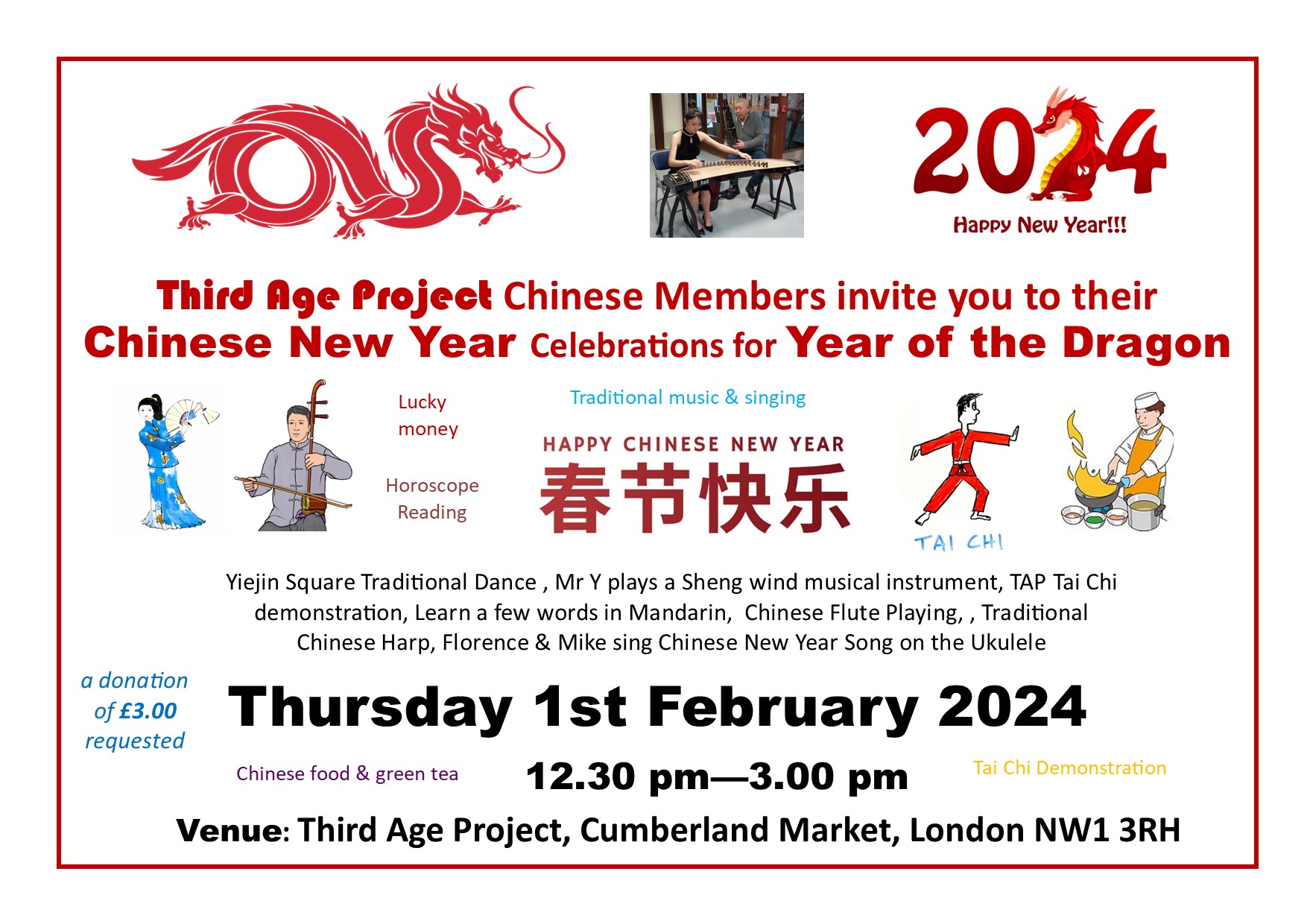 Chinese New Year Celebration 2024+ Add to Google Calendar+ iCal / Outlook export DateFeb 01 2024Expired! Time 12:30 pm - 3:00 pm LocationThird Age ProjectThird Age Project, Cumberland Market, Regent’s Park, London NW1 3RH Category Connect Organizer Third Age Project Phone +44 20 7383 4922 Email info@thirdageproject.org.ukShare this event