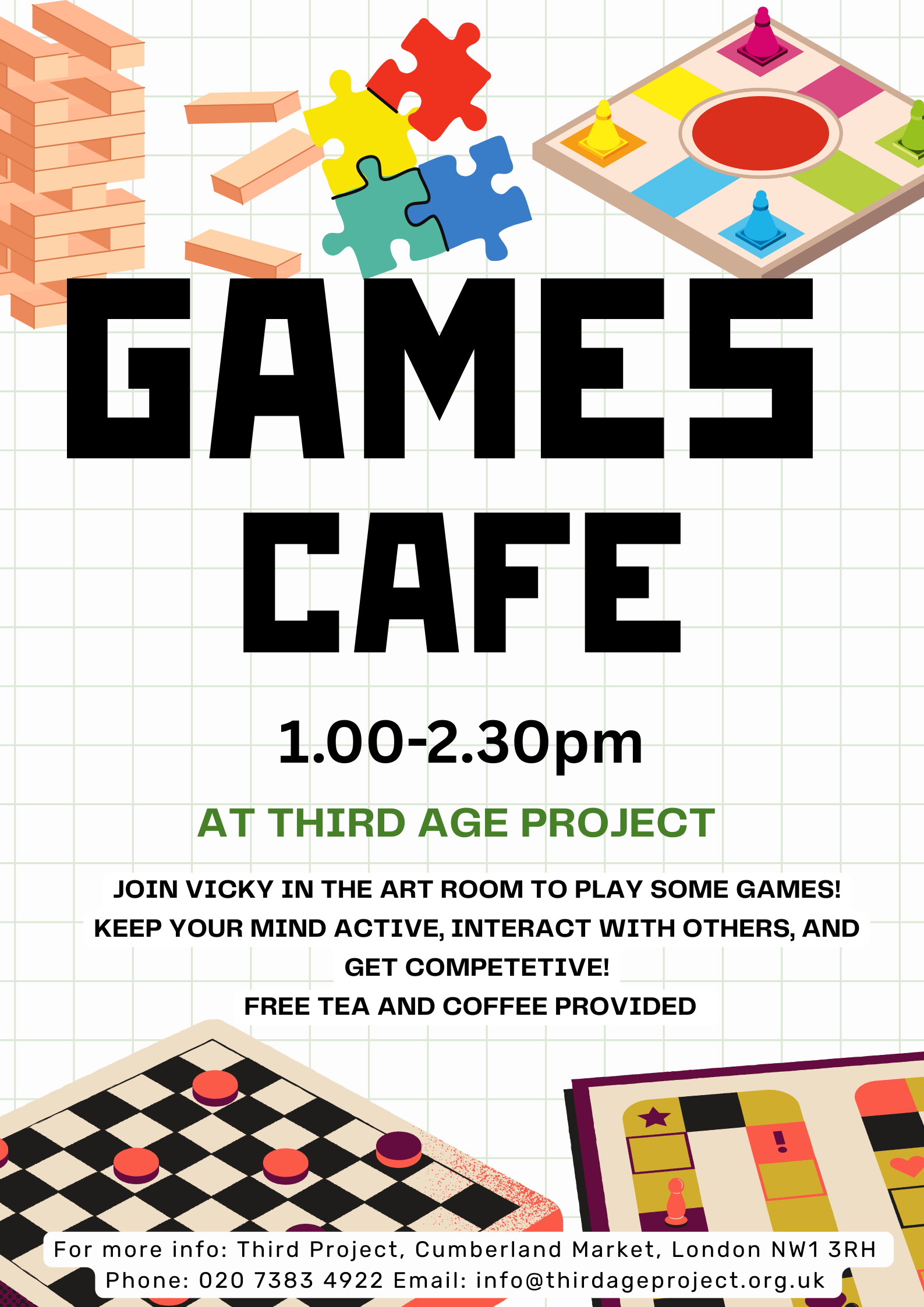 Games Cafe+ Add to Google Calendar+ iCal / Outlook export DateJan 23 2026 Time 1:00 pm - 2:30 pm LocationThird Age ProjectThird Age Project, Cumberland Market, Regent’s Park, London NW1 3RH Category Connect Organizer Third Age Project Phone +44 20 7383 4922 Email info@thirdageproject.org.ukShare this event