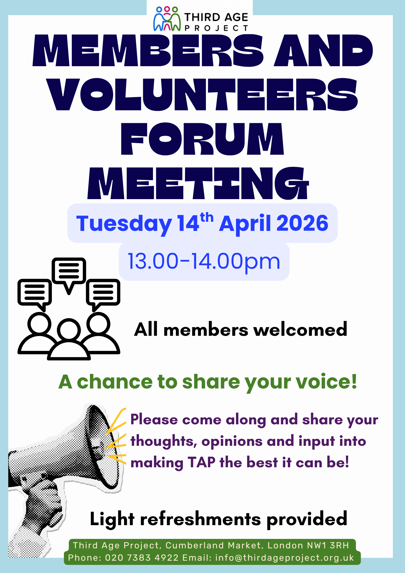 Members & Volunteers Forum Meeting+ Add to Google Calendar+ iCal / Outlook export DateApr 14 2026Expired! Time 1:00 pm - 2:00 pm LocationThird Age ProjectThird Age Project, Cumberland Market, Regent’s Park, London NW1 3RH Category Connect Organizer Third Age Project Phone +44 20 7383 4922 Email info@thirdageproject.org.ukShare this event
