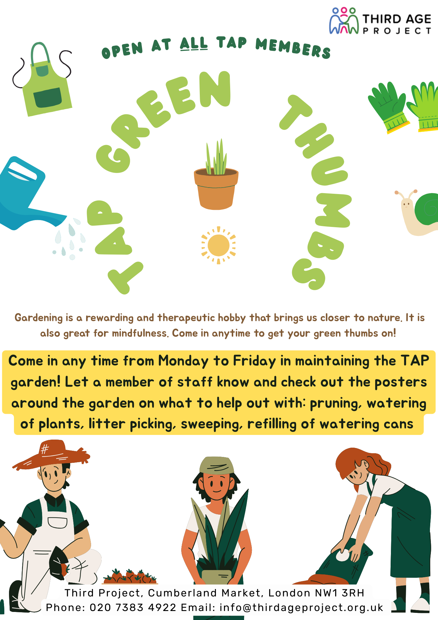 TAP Green ThumbsTAP Green ThumbsAny time, any day! Drop in to help us maintain the TAP Garden. All TAP members welcome.+ Add to Google Calendar+ iCal / Outlook export DateSep 05 2025Expired! Category Be Mindful Share this event