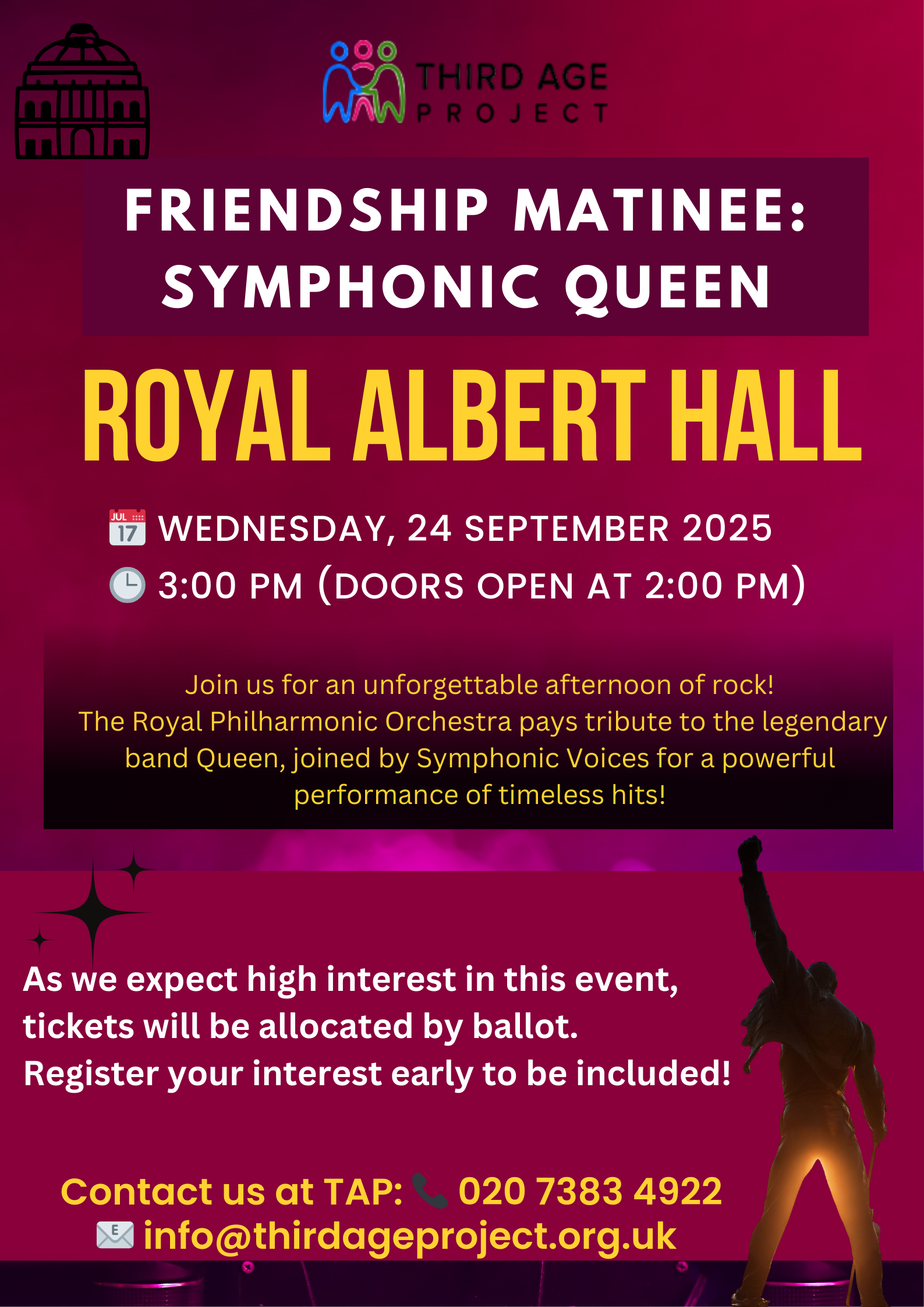Trip to Royal Albert HallFriendship Matinee: Symphonic QueenWe’re excited to share that we’ve been fortunate enough to secure a limited number of tickets for this spectacular event!+ Add to Google Calendar+ iCal / Outlook export DateSep 24 2025Expired! Time 3:00 pm Category Connect Organizer Third Age Project Phone +44 20 7383 4922 Email info@thirdageproject.org.ukShare this event
