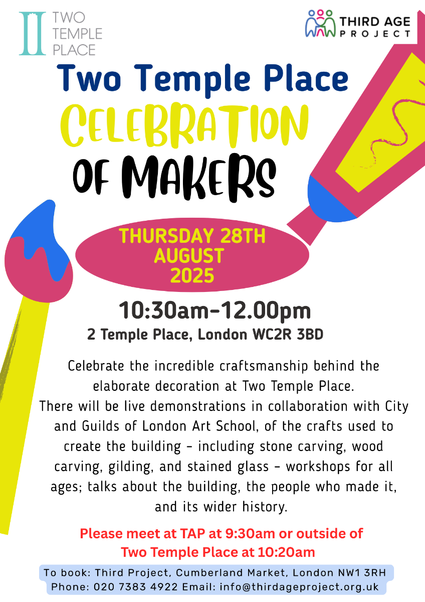 On Thursday, 28st of August, there will be a trip Two Temple Place. Celebrate the incredible craftsmanship behind the elaborate decoration at Two Temple Place. We will have live demonstrations in collaboration with City and Guilds of London Art School, of the crafts used to create the building – including stone carving, wood carving, gilding, and stained glass – workshops for all ages; talks about the building, the people who made it, and its wider history. Book your spot today! 📅 Thursday 28th August 🕧Time: 10.30 to 12.00pm 📍Two Temple Place Meet at TAP at 9:30 or meet us outside of the Science Museum at 10:50am. When booking, please ensure you inform staff whether you will be meeting at TAP or the outside of Two Temple Place. If you would like to book your spot, please contact us at TAP: 📞 020 7383 4922 📧 info@thirdageproject.org.uk |